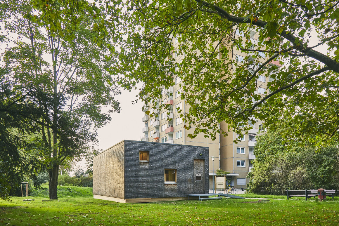 In one of these neighborhood spaces, right between the three high-rise buildings in the Reichelstraße estate, just a stone’s throw away from the Ginnheim terminus (U1) and close to Ginnheimer Landstraße, will be the Ginnheim Flying Artists’ Room. It is intended to activate and encourage residents to participate in improving the design of their living environment and their district.