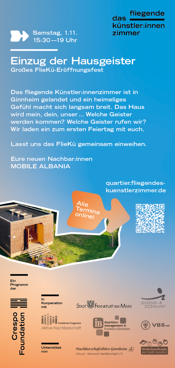 Das fliegende Künstler:innenzimmer ist in Ginnheim gelandet – gemeinsam mit der Künstler:innen-Gruppe Mobile Albania laden wir herzlich zur Eröffnung am 1. November von 15:30–19:00 Uhr ein.