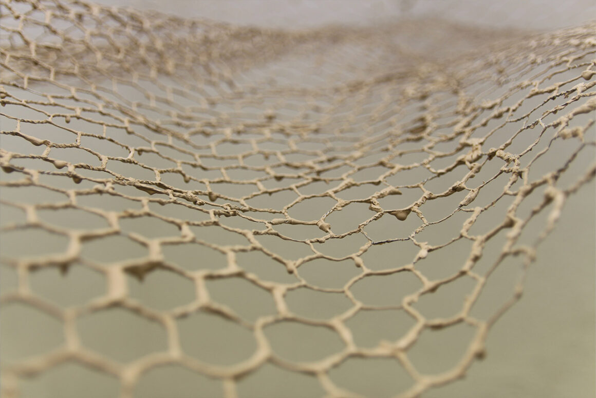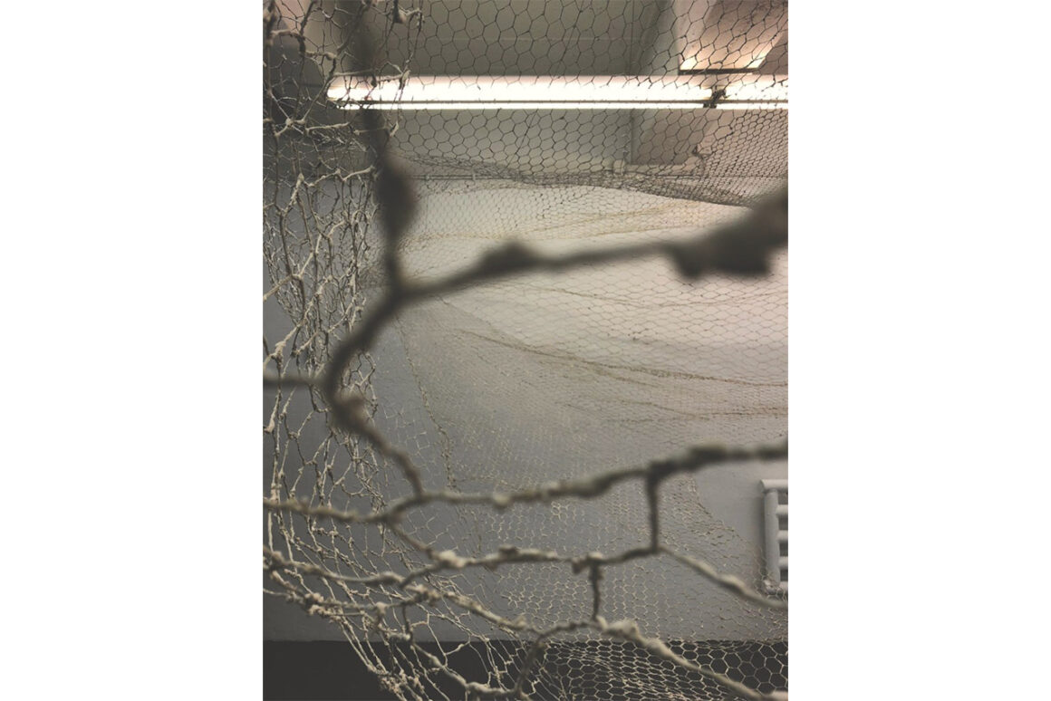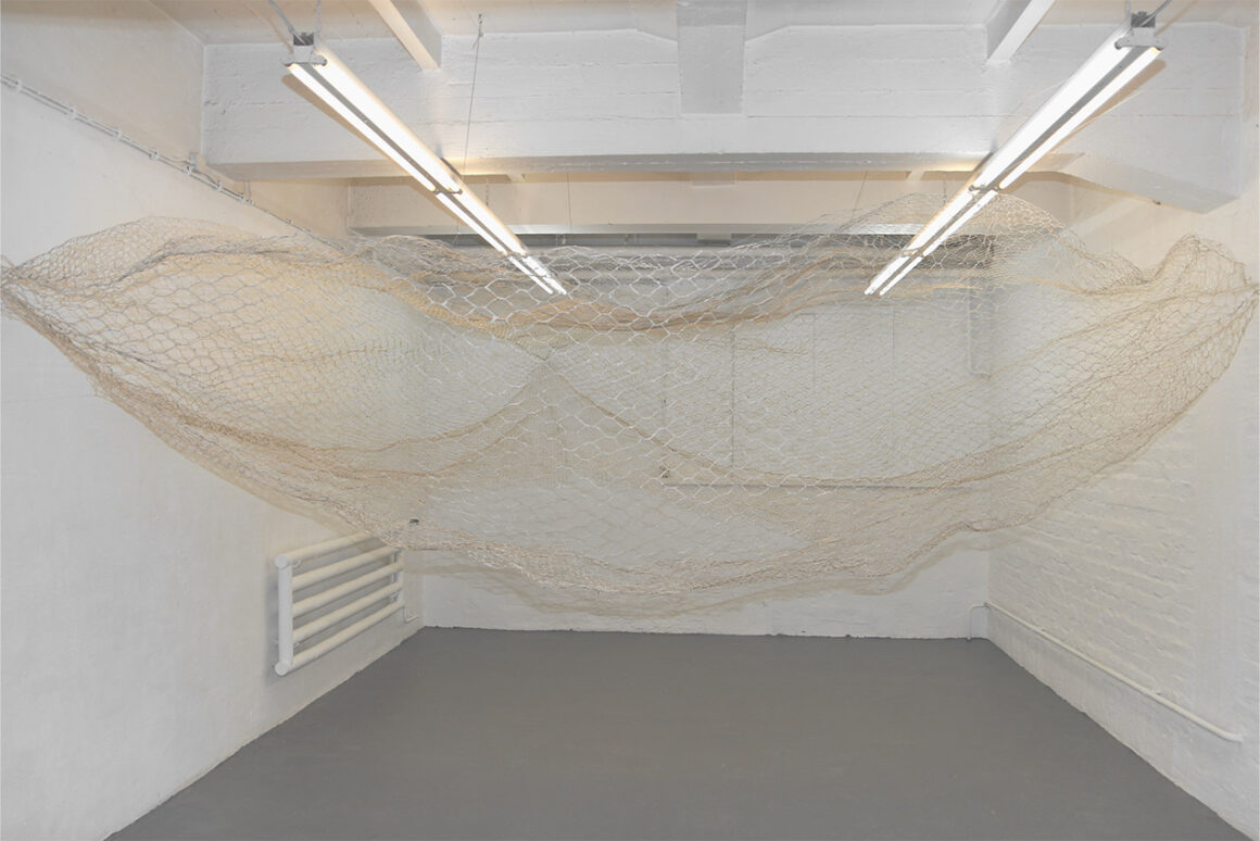 Bacillariophyceae ist die wissenschaftliche Bezeichnung für mikroskopisch kleine, photosynthetisch aktive Kieselalgen (Diatomeen), die planktisch oder am Gewässerboden in Süß-und Salzwasser vorkommen. Die Arbeit übersetzt ihre im Durchschnitt nur rund 40 Mikrometer großen, glasartigen Kieselskelette – weit feiner als ein menschliches Haar – vom Mikromaßstab in eine raumgreifende, biomorphe Installation. So wird eine sonst verborgene Struktur der Natur körperlich, räumlich und sinnlich zugänglich. Kieselalgen spielen eine zentrale Rolle im marinen Kohlenstoffkreislauf. Sie nutzen im Wasser gelöstes Kohlendioxid, um neues organisches Material aufzubauen. Nach ihrem Absterben sinken sie in die Tiefe und tragen dazu bei, Kohlenstoff langfristig im Meeresboden zu binden. Bacillariophyceae nimmt diese unscheinbaren Akteur:innen des globalen Stoffwechsels ernst und hebt sie als fragile, aber wirkmächtige Ko- Produzent:innen unserer Umwelt hervor. Die regelmäßig gewobenen Maschen des Drahtes verweisen auf die hochgradig geordneten, symmetrischen Poren der Kieselskelette. Unterschiedliche Maschenweiten wurden ineinander verwoben, um die komplexe Struktur möglichst zu imitieren. Der Drahtkörper ist Schicht für Schicht mit Kieselgur – sogenannter Diatomeenerde – umhüllt, deren feinkörnige Materialität die mineralische Hülle der Algen nachzeichnet. Kieselgur entsteht, wenn Kieselalgen absterben, ihre organischen Bestandteile zersetzt werden und die Siliziumdioxid-Schalen sich als Sediment am Grund von Seen und Ozeanen ablagern. In einem Milliliter Kieselgur befinden sich über eine Milliarde Diatomeenschalen und deren Bruchstücke. Für Bacillariophyceae wurden so rechnerisch knapp 30 Billionen dieser mikroskopischen Skelette verarbeitet.
