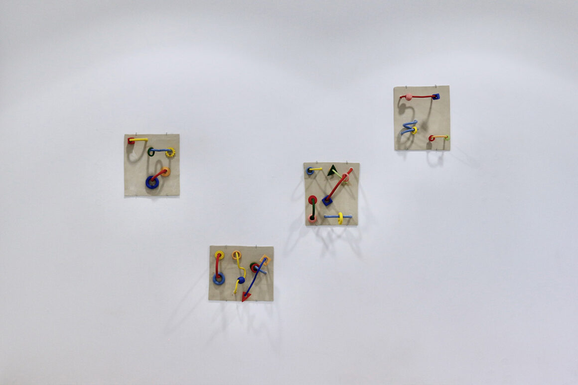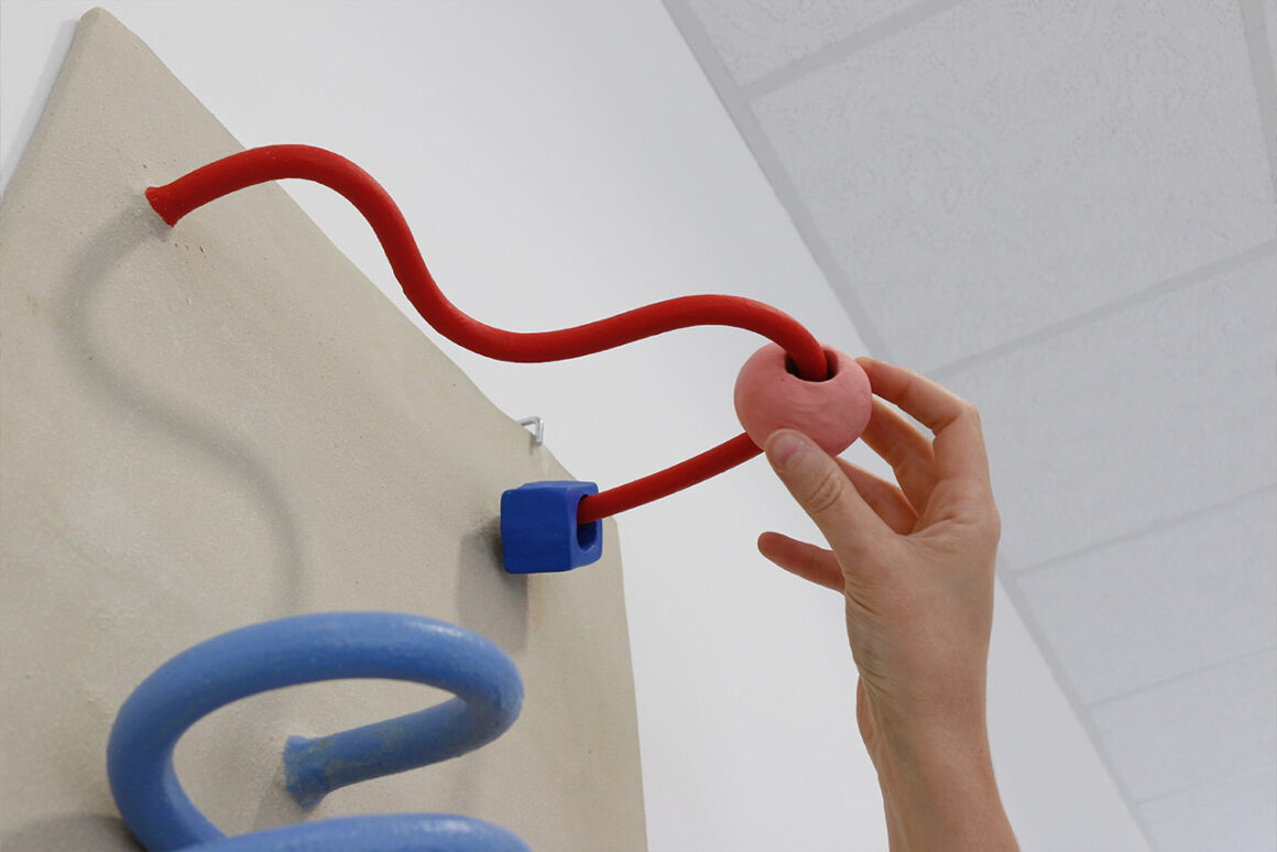 (Don’t) Touch Me besteht aus vier keramischen Objekten (je 42 cm x 47 cm x 20 cm), deren Form an, in spielerischen oder ergotherapeutischen Kontexten eingesetzten, Motorikschleifen erinnert – Elemente, um frühkindliche Feinmotorik, Hand-Auge- Koordination, räumliches Denken sowie das visuelle Verständnis für Farbe und Form zu fördern. Thematisiert werden Transformationsprozesse, die sowohl das Material als auch die gestaltende Person während des Herstellungsprozesses durchlaufen. Im Zentrum stehen Berührung, damit verbundene persönliche Grenzen, der notwendige Konsens und die Achtsamkeit, die Berührung begleitet. Die Arbeit löst sich von der rigiden Unterbindung taktiler Erfahrung, wie sie in institutionellen Kunstkontexten häufig anzutreffen ist, und eröffnet einen Raum für bewusste haptische Interaktion. Das Verhalten der Betrachter:innen im Umgang mit den Objekten beeinflusst dabei unmittelbar die auditive Wahrnehmung: Je nachdem, mit welcher Sorgfalt die Elemente entlang der Schleifen bewegt werden, entsteht – materialbedingt – ein kratzendes, widerständiges Geräusch oder eine nahezu geräuschlose, fließende Bewegung.